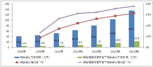 圖表 5 2008-2014年中國融合會議市場規(guī)模及增長率