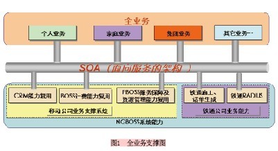 為了適應(yīng)全業(yè)務(wù)競爭的需要,長遠(yuǎn)規(guī)劃業(yè)務(wù)支撐系統(tǒng),移動采用SOA(Service Oriented architecture,面向服務(wù)的架構(gòu))技術(shù)對業(yè)務(wù)支撐系統(tǒng)進(jìn)行了改造,并把鐵通資源融合進(jìn)SOA架構(gòu),改造項目以業(yè)務(wù)支撐系統(tǒng)SOA架構(gòu)為基礎(chǔ),進(jìn)行寬帶業(yè)務(wù)合營和IPPBX固話業(yè)務(wù)合營,構(gòu)建基于SOA架構(gòu)的一體化服務(wù)營銷支撐體系。