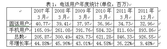 政府對(duì)電信市場的開放不僅帶來了電信產(chǎn)業(yè)的快速發(fā)展,激烈的競爭也令消費(fèi)者享受到性價(jià)比更高的服務(wù)。近幾年,電話用戶總數(shù)持續(xù)增長,從1999年的2281萬增加到2011年3月底的8億4633萬。截至2011年12月31日,電話用戶總數(shù)達(dá)到9億2655萬,說明從2011年4-12月期間新增用戶8022萬。其中,手機(jī)用戶數(shù)增長最為顯著,從2007年的1億6509萬增加到2011年3月的8億1160萬,2011年12月底達(dá)到8億9386萬。但是,固話用戶的數(shù)量則從2007年的4077萬減少到2011年3月的3473萬,到2011年12月僅有3269萬。(見表1)