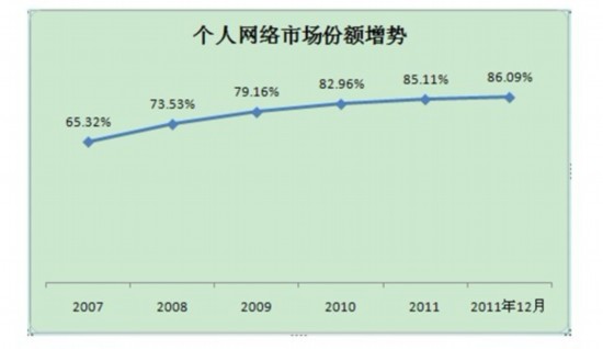相反,固話的市場份額卻在持續(xù)下降,從2007年的19.81%到2011年12月的3.53%。手機(jī)時(shí)尚、輕便、性價(jià)比高,廣受歡迎,所以增長速度越來越快。現(xiàn)在手機(jī)已經(jīng)是尋常百姓的尋常物品了。