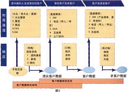 ——銷售支持:東京煤氣公司擁有三種主要的家用產(chǎn)品:地板式空調(diào),煤氣暖氣及煤氣衣服干燥機(jī)。此公司于1993年開始運(yùn)用數(shù)據(jù)庫營銷,現(xiàn)已取得了驕人的成果。其中主力產(chǎn)品——地板式空調(diào),盡管周期長、價(jià)格高,1997年一年就銷售了3萬6千套,同時(shí)從對這些用戶調(diào)查的結(jié)果發(fā)現(xiàn)“滿意”的占96%。下面介紹一下“地板式空調(diào)”的營銷方法(見圖5)