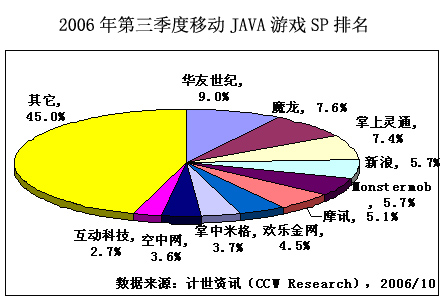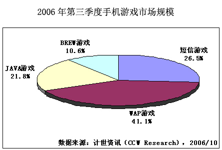 計世資訊(CCW Research)數(shù)據(jù)顯示,2006年第三季度中國手機(jī)游戲市場規(guī)模達(dá)到6.7億元人民幣,比第二季度增長11.9%。 手機(jī)游戲市場規(guī)模包括移動運營商、手機(jī)游戲服務(wù)提供商在手機(jī)游戲業(yè)務(wù)上的總體收入,但不包括手機(jī)游戲軟件開發(fā)商的收入。第三季度,短信游戲增速繼續(xù)放緩,短信游戲市場規(guī)模達(dá)到1.8億元,占手機(jī)游戲市場份額的26.5%。WAP,JAVA和BREW游戲繼續(xù)保持快速增長,第三季度WAP、JAVA和BREW游戲市場規(guī)模分別為2.8億元、1.4億元和0.7億元。