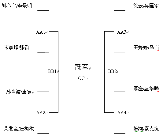 | 時(shí)間 | 15:00-15:20 | 比賽項(xiàng)目 | 雙打半決賽 | 場(chǎng)地號(hào) | 1 |