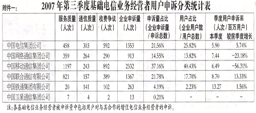 為加強(qiáng)社會監(jiān)督,推進(jìn)電信服務(wù)質(zhì)量持續(xù)改善,根據(jù)《中華人民共和國電信條例》相關(guān)規(guī)定,現(xiàn)將2007年第三季度電信服務(wù)質(zhì)量有關(guān)情況公布如下。