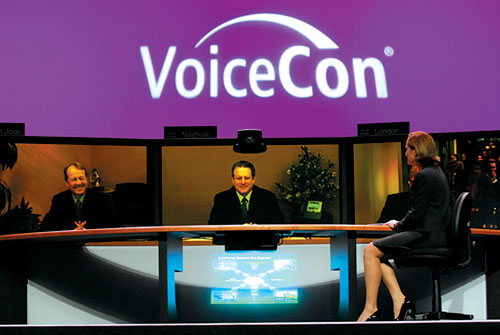 John Chambers和美國前副總統(tǒng)Al Gore利用網真系統(tǒng)參與VoiceCon大會