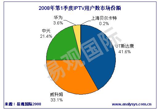 《2008年第1季度中國(guó)IPTV市場(chǎng)季度監(jiān)測(cè)》數(shù)據(jù)顯示,2008年第1季度中國(guó)IPTV累計(jì)用戶數(shù)達(dá)131萬(wàn)人。根據(jù)各廠商中標(biāo)業(yè)務(wù)區(qū)實(shí)際發(fā)展的用戶數(shù)排名,UT斯達(dá)康、威科姆、中興通訊位居前三。2008年第1季度IPTV廠商的競(jìng)爭(zhēng)格局沒(méi)有顯著變化。