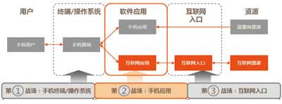 在楊俊看來,應(yīng)用商店的到來改變了傳統(tǒng)模式。例如,開放的互聯(lián)網(wǎng)模式推倒了原來的花園圍墻,手機軟件類型從單機應(yīng)用走向在線應(yīng)用,手機軟件來源從內(nèi)置型轉(zhuǎn)向用戶自主下載、自定制和自安裝。最重要的是,各大廠商不僅滿足于應(yīng)用商店這一畝三分地,而是把觸角延伸到了產(chǎn)業(yè)鏈上的各個環(huán)節(jié),由此形成了三個主要戰(zhàn)場:手機終端及操作系統(tǒng)、手機應(yīng)用、互聯(lián)網(wǎng)入口,具體見圖所示。