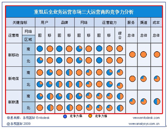 盡管產(chǎn)業(yè)鏈完備程度相差較為明顯,但運(yùn)營商各自業(yè)務(wù)與用戶服務(wù)運(yùn)營能力對(duì)3G時(shí)常的發(fā)展影響也至關(guān)重要,根據(jù)易觀國際Enfodesk發(fā)布的《國內(nèi)運(yùn)營商3G業(yè)務(wù)發(fā)展策略研究系列—中國3G市場(chǎng)現(xiàn)狀與發(fā)展策略概述》報(bào)告顯示,在發(fā)展3G的過程中,三大運(yùn)營商各自有一定的優(yōu)劣勢(shì):