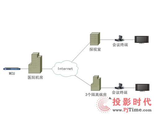 醫(yī)院的中心機房部署1臺多點控制單元(MCU),3個隔離病房、1個探視室各部署一套視頻會議終端、1個電視機/顯示器,網(wǎng)絡拓撲圖如下: