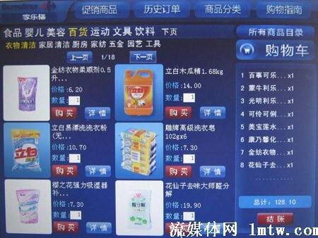 記者在家樂福IPTV購物平臺(tái)上看到,商品的種類相當(dāng)豐富,按日常用到的分成了食品、嬰兒、美容、百貨、運(yùn)動(dòng)、文具、飲料幾個(gè)大類,而每一類里又分成不同的小類,比如美容類里又分護(hù)膚、清潔、男士、彩妝、紙巾等小類。其價(jià)格與在家樂福購物相同,并且還有不少產(chǎn)品在打折。滿118元即可免費(fèi)配送,對(duì)于沒有時(shí)間、精力逛超市的人來講,可以說相當(dāng)方便。