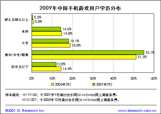 當(dāng)樂網(wǎng)調(diào)研數(shù)據(jù)顯示,2009年手機(jī)游戲用戶中高中(含中專、職高)部分的比例較2008年有所增長,增長幅度達(dá)3.9個百分點(diǎn),其余各學(xué)歷階段的用戶比例則均出現(xiàn)不同程度的下降。