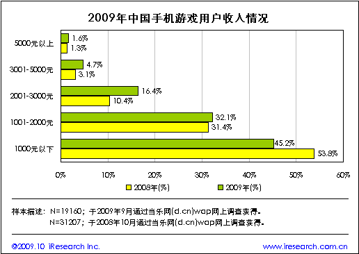 當(dāng)樂網(wǎng)調(diào)研數(shù)據(jù)顯示,2009年手機(jī)游戲用戶的月收入在1000~3000元之間的占比為48.5%,較2008年增長6.7個百分點(diǎn)。收入高于2000元的中高收入用戶群體占22.7%,比2008年占比上升7.9個百分點(diǎn),收入在1000元以下的低收入群體占45.2%,比2008年占比減少8.6個百分點(diǎn)。與2008年對比,2009年手機(jī)游戲用戶的收入水平有明顯提高,用戶的消費(fèi)潛力有所增強(qiáng)。