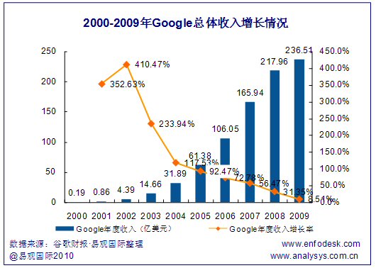 從谷歌的總體營收增長情況可以看出,谷歌雖然保持了相對平穩(wěn)的整體營收增長態(tài)勢,但是其增長速率已經(jīng)從2001、2002年超過300%的高速增長降低到2009年的8.54%。整體來看,谷歌的營收增長能力已經(jīng)大幅度降低,減緩收入下滑速度的業(yè)務(wù)發(fā)展壓力下,谷歌需要拓展新的市場以重新構(gòu)建業(yè)務(wù)的高速增長。