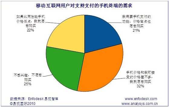 據(jù)Enfodesk易觀智庫最新報(bào)告《中國移動(dòng)互聯(lián)網(wǎng)市場用戶研究報(bào)告2010》研究發(fā)現(xiàn),目前在移動(dòng)互聯(lián)網(wǎng)用戶中,有75%的用戶對(duì)具有移動(dòng)支付功能的手機(jī)表現(xiàn)出明顯的興趣,其中影響不大,完全靠性價(jià)比決定是否購買的用戶占比最多,約為32%,只有在移動(dòng)具備支付功能的手機(jī)和可接受價(jià)格相近時(shí)才會(huì)購買。另外21%的人由于對(duì)移動(dòng)支付業(yè)務(wù)需求程度較高,愿意為此付出更高價(jià)格,其他22%的用戶則在比同性能手機(jī)價(jià)格低些之后,才會(huì)進(jìn)行消費(fèi)。除此之外,還有25%的用戶對(duì)于具備支付功能的手機(jī)沒有絲毫興趣,不愿意購買。