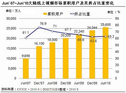 據(jù)中國互聯(lián)網(wǎng)絡(luò)信息中心(CNNIC)調(diào)查,至2010年6月,中國在線視頻用戶已達(dá)2.5億,所占比重是4.2億網(wǎng)絡(luò)用戶的63.2%;據(jù)易觀國際統(tǒng)計(jì),2009年中國在.線視頻市場(chǎng)規(guī)模達(dá)人民幣8.44億元,較2008年成長95.4%,其在使用人口及市場(chǎng)規(guī)模表現(xiàn),成為各方爭(zhēng)奪之地。