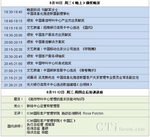 CTI論壇(ctiforum)8月3日消息(記者 潘婷婷):“第八屆中國呼叫中心產(chǎn)業(yè)高峰論壇暨第八屆中國最佳呼叫中心及最佳管理人頒獎大會”定于2010年8月10日在上海國際貴都大飯店召開。此次大會是由中國信息化推進(jìn)聯(lián)盟客戶關(guān)系管理專業(yè)委員會主辦,ICMI國際客戶管理學(xué)院(中國區(qū))承辦。通過本次大會,與會者將獲得中國最佳呼叫中心實踐經(jīng)驗和最佳解決方案的分享,與業(yè)界精英共話呼叫中心和客戶關(guān)系管理的未來。