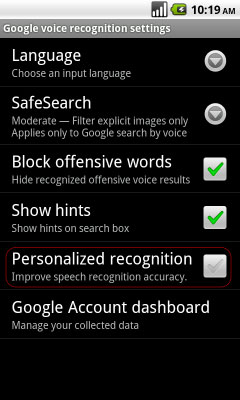 當(dāng)?shù)谝淮未蜷_新版語音搜索的時(shí)候,會(huì)看到是否開啟個(gè)性化識別的提示。用戶隨時(shí)可以在菜單中開啟或關(guān)閉個(gè)性化語音識別功能,如果想徹底清除相關(guān)記錄,可以在https://www.google.com/dashboard/中進(jìn)行刪除。