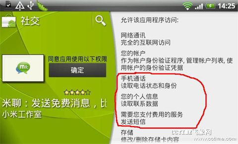 國(guó)內(nèi)外Kik類(lèi)應(yīng)用也逐漸興起,騰迅最近也加入此陣營(yíng)并推出其下產(chǎn)品微信。Kik類(lèi)應(yīng)用主要以用戶手機(jī)中聯(lián)系人目錄為主要的關(guān)系抓取,只要其聯(lián)系人中裝入該客戶端,用戶無(wú)需特意添加即可開(kāi)始類(lèi)似短信的聊天。以KikMessenger為例,其中便涉及讀取用戶聯(lián)系人信息、電話狀態(tài)和身份等權(quán)限。