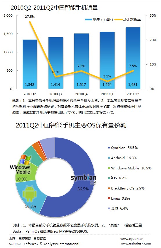 CTI論壇(ctiforum)4月29日消息(記者 潘婷婷):根據(jù)易觀智庫EnfoDesk近期發(fā)布數(shù)據(jù)顯示,中國智能手機(jī)市場(chǎng)2011年第2季度國內(nèi)銷售總量達(dá)1681萬部(不計(jì)黑手機(jī)和水貨手機(jī)),環(huán)比增長(zhǎng)7.5%。