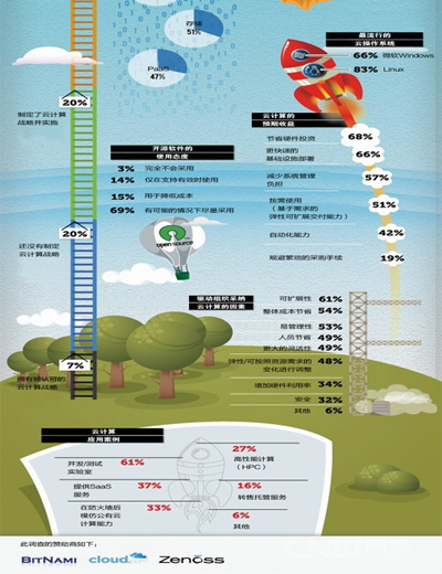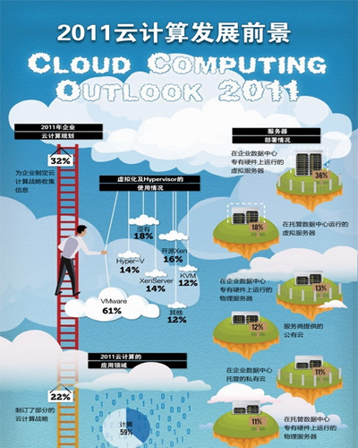 《2011云計算發(fā)展前景調(diào)查報告》的目標在于收集企業(yè)用戶中使用虛擬化和云計算技術(shù)的信息,有助于公眾了解云計算技術(shù)及其服務(wù)的演進。這份調(diào)查報告的結(jié)果來自2011年第二季度對BitNami、Cloud.com和Zenoss開源與系統(tǒng)管理社區(qū)中500多位用戶的調(diào)查。其目的是想看清楚云計算技術(shù)的使用趨勢,并對部署虛擬基礎(chǔ)設(shè)施提供參考。