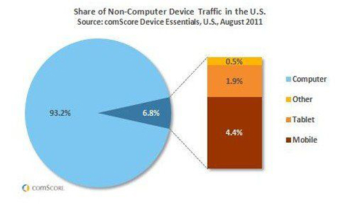 市場研究公司comScore發(fā)表報告稱,8月份,智能手機和平板電腦等“非計算機”設備在美國互聯網流量中的份額由6月底時的6.2%增長至6.8%。