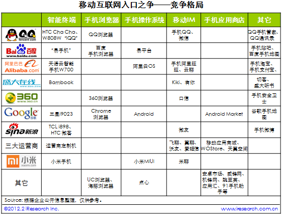 2011年,移動(dòng)互聯(lián)網(wǎng)領(lǐng)域發(fā)展熱度很高,競(jìng)爭(zhēng)激烈。艾瑞咨詢整理發(fā)現(xiàn),移動(dòng)端的“用戶入口”成為傳統(tǒng)互聯(lián)網(wǎng)巨頭、移動(dòng)運(yùn)營(yíng)商和移動(dòng)互聯(lián)網(wǎng)企業(yè)競(jìng)爭(zhēng)的聚焦點(diǎn)。這充分體現(xiàn)出,第一,移動(dòng)互聯(lián)網(wǎng)的發(fā)展前景好,第二,移動(dòng)互聯(lián)網(wǎng)目前仍處在用戶積累和行為培養(yǎng)的過(guò)程。