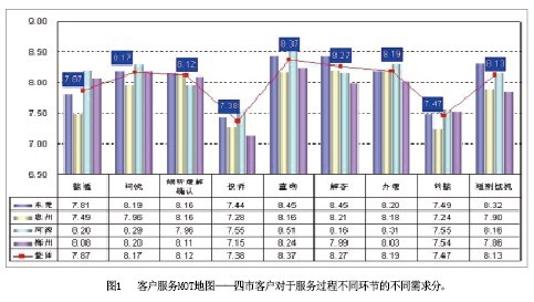 客戶服務MOT地圖(圖1)——該模塊通過對10086熱線服務過程的全景式展示,直觀表現(xiàn)不同地區(qū)、不同品牌客戶在10086熱線服務不同環(huán)節(jié)上的核心需求,話務員通過本模塊,可以迅速把握10086熱線服務的要點;