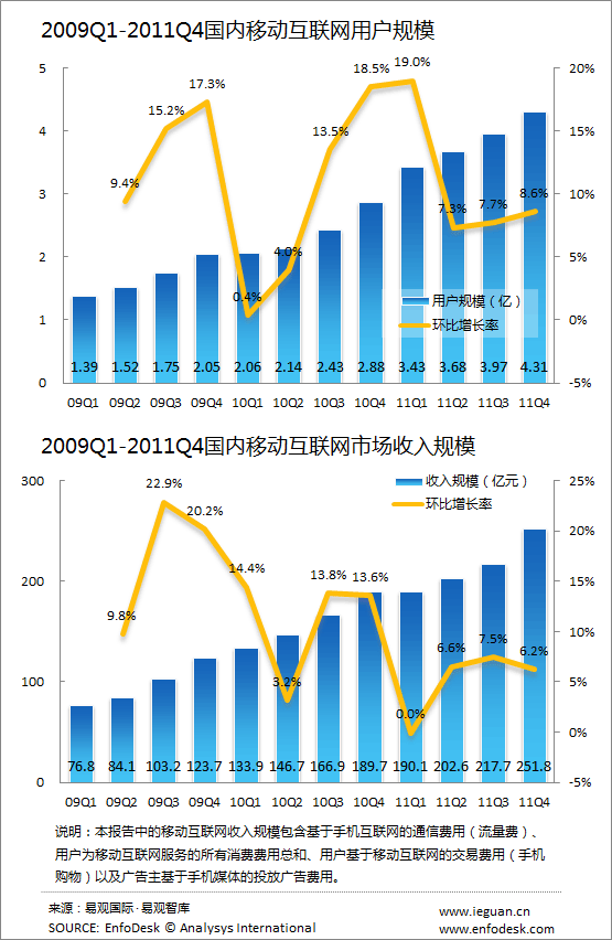 從用戶及收入規(guī)模來看,用戶規(guī)模的增速相對穩(wěn)定,2011年第4季度相比上季度在整體手機(jī)銷量下降的前提下,智能手機(jī)保持較快速的增長,增速達(dá)16.77%,外加臨近年底,微博等移動(dòng)應(yīng)用的活躍度有所提高,整體用戶規(guī)模增速并未呈現(xiàn)下滑。