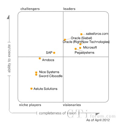 位于魔力象限中領(lǐng)導(dǎo)者(leaders)象限的廠商有salesforce.com公司、Oracle (RightNow Technologies)公司、Oracle (Siebel)公司、Microsoft公司和Pegasystems 公司。位于挑戰(zhàn)者(challengers)象限的廠商是SAP公司。位于觀望著(niche players)象限的廠商是Amdocs公司、Astute Solutions公司、Nice Systems公司和Sword Ciboodle公司。