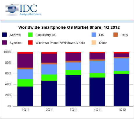 Android和蘋果的iOS繼續(xù)主導(dǎo)全球智能手機(jī)行業(yè),這兩個(gè)平臺(tái)的總出貨量占到2012年一季度所有智能手機(jī)出貨量的82%。其中Android手機(jī)以8900萬臺(tái)占據(jù)整個(gè)行業(yè)出貨量的59%,而蘋果以3510萬臺(tái)的出貨量占據(jù)23%的市場份額。這些數(shù)據(jù)均來自IDC的最新研究報(bào)告。