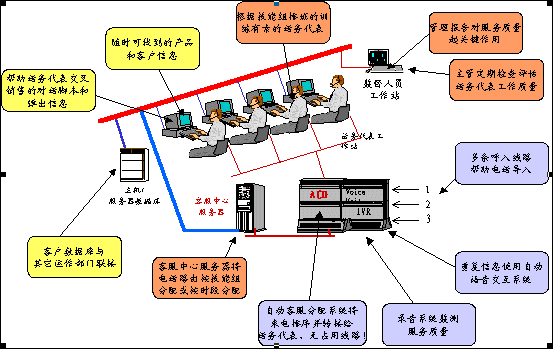 。。呼叫中心就是在一個相對集中的場所,由一批服務(wù)人員組成的服務(wù)機(jī)構(gòu),通常利用計(jì)算機(jī)通訊技術(shù),處理來自企業(yè)顧客的電話垂詢,尤其具備同時處理大量來話的能力,還具備主叫號碼顯示,可將來電自動分配給具備相應(yīng)技能的人員處理,并能記錄和儲存所有來話信息。一個典型的以客戶服務(wù)為主的呼叫中心可以兼具呼入與呼出功能,當(dāng)處理顧客的信息查詢、咨詢、投訴等業(yè)務(wù)的同時,可以進(jìn)行顧客回訪、滿意度調(diào)查等呼出業(yè)務(wù)。