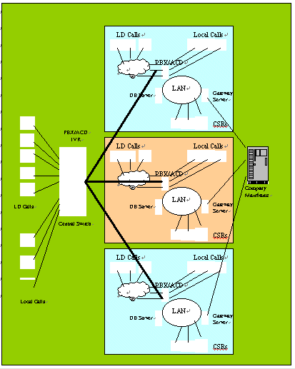 。。網(wǎng)絡(luò)式呼叫中心定義如下:該呼叫中心具備轉(zhuǎn)移呼叫來話的能力,可以在沒有可以利用的客戶服務(wù)代表的時候,將來話轉(zhuǎn)移給另一個呼叫中心。這種來話路由的功能是即復(fù)雜又初級,該功能可以由呼叫中心管理人員或者電話服務(wù)提供商所控制。對于網(wǎng)絡(luò)式呼叫中心的設(shè)計(jì)而言,從根本上來說與獨(dú)立式呼叫中心非常相似,只是具備了內(nèi)部聯(lián)網(wǎng)線路,或者稱為虛擬專用網(wǎng)(VPN)。在同一個網(wǎng)絡(luò)框架下,每個呼叫中心之間都配置了相同的設(shè)備,包括電話程控交換機(jī)、ACD、IVR和CTI等,就其中的某一個呼叫中心而言又是相對獨(dú)立的。與獨(dú)立式呼叫中心相比,網(wǎng)絡(luò)式呼叫中心最顯著的特點(diǎn)是將各個獨(dú)立的呼叫中心相連,包括語音信息與數(shù)據(jù)信息。這種手段有ISDN,E-1,甚至利用VoIP的方式。請見下圖。