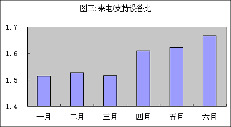 圖一到圖三中我們可以看到來電總量從一季到下一季度增加了15%。從前一季度開始到后一季度結(jié)束設(shè)備總量增加了8%。每月平均來話/設(shè)備比在六個(gè)月中從1.5增強(qiáng)到1.7。