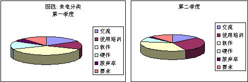 為什么單位設(shè)備來電會(huì)增加呢?如果把來電的原因(圖四)分為以下幾類:軟件、硬件、溝通、使用訓(xùn)練、要求、放棄,我們可能會(huì)注意到在其他項(xiàng)略有減少的同時(shí),使用訓(xùn)練從開始時(shí)的15%躍到第二季度的30%。當(dāng)然,和其他部門合作,這一問題是可以采取各種方式加以解決的。