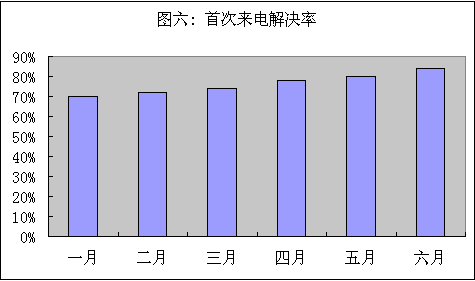 圖六反映了本例首次來電和解決率及平均解決時(shí)間。我們可以看到總體趨勢管理良性發(fā)展。