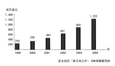 亞太地區(qū)正在成為CRM應(yīng)用軟件的新興市場(chǎng)。1999年亞太地區(qū)CRM市場(chǎng)的年增長(zhǎng)率達(dá)33.5%。其中中國(guó)CRM市場(chǎng)是除日本外最具發(fā)展?jié)摿Φ氖袌?chǎng)。預(yù)計(jì)到2004年,中國(guó)CRM市場(chǎng)的復(fù)合年平均增長(zhǎng)率為60%。
