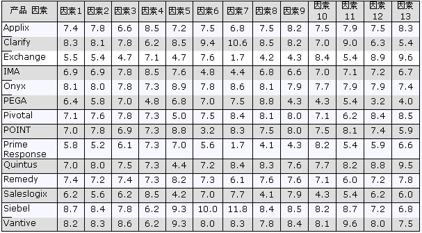 下表摘自Gartner Group 2000年六月份對14種CRM廠商和產(chǎn)品的比較。原來的報告以柱狀圖的形式進行比較,為了縮短篇幅,我們轉(zhuǎn)化為表格形式借以引用。
