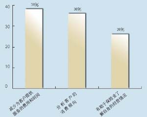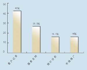 關于所應用的CRM類型,有5家是呼叫中心,5家是分析型,7家是運營型,2家是屬于大型企業(yè)CRM。其中13家擁有動態(tài)客戶數據庫,占到68.4%。這其中又有42%利用數據庫作客戶記錄,26.3%作為客戶支持使用,15.7%用作統(tǒng)計分析,另有16%作為市場推廣。保險公司與客戶聯系的方式,從重要性來看依次為:面對面\電話\網絡\傳真,這說明保險公司對于與客戶進行人性化交流的重視。在問到CRM的主要作用時,有5家表示使用CRM有助于保險業(yè)了解自身的經營情況,幫助公司準確地發(fā)現贏利客戶和具有贏利潛力的客戶,有7家認為使用CRM有助于分析客戶的消費傾向,有7家認為使用CRM有助于優(yōu)化信息和資源管理。在問到是否愿意為像CRM系統(tǒng)這樣的咨詢或服務付費時,有11家表示愿意,占到57.8%。