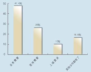 在問到對CRM的熟悉程度方面,有12家表示熟悉,占到63.2%,另有7家表示不熟悉,說明許多企業(yè)已經對CRM有一定了解,不過也仍有相當大的市場空間。其中有8家建立了CRM系統(tǒng),占到42%,計劃建立的有9家,占到47.4%,而有2家表示短期不會建立。從調查發(fā)現,幾乎所有受訪者都接受和認同CRM,盡管有一些企業(yè)還不熟悉,但在調查問卷中對此表現出極大的興趣。在CRM的采購動機上,有9家表示是為了提高業(yè)務,占到將近一半的比例(47.4%),而有5家表示出于企業(yè)宣傳,2家屬于上級主管部門要求,有3家表示是出于同行的示范。調查顯示,企業(yè)獲得CRM的信息來源很廣,最多的是通過報刊雜志的廣告,有6家,占31.6%,而上級推薦和供應商推薦各有4家,各占21%,有兩家是集成商推薦,此外還有3家通過展會獲得相關信息。