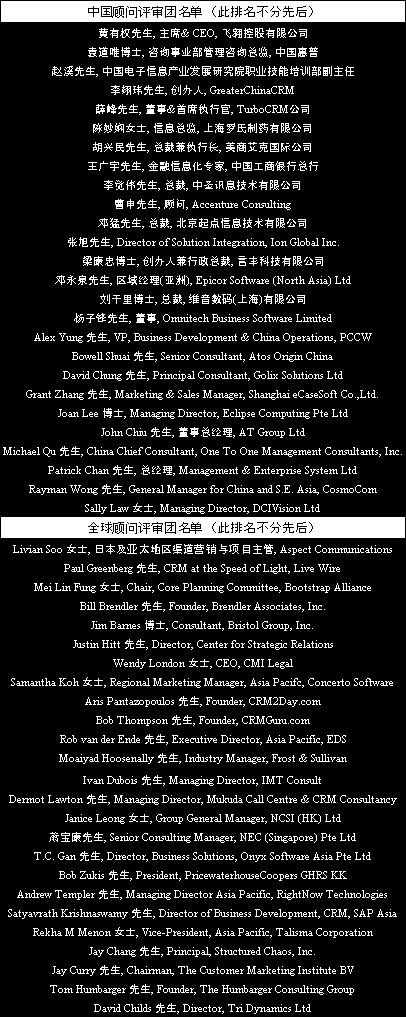 五、 權(quán)威性。GreaterChinaCRM邀請該機(jī)構(gòu)50多位(包括中國和外國)最權(quán)威的CRM專家擔(dān)當(dāng)此次評選的評審團(tuán)。