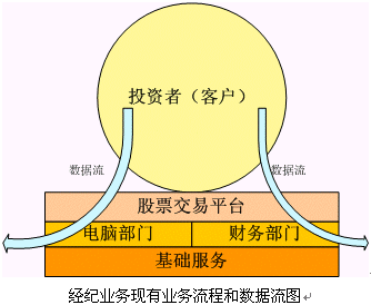 。。從上圖可以看出,現(xiàn)在的證券公司的經(jīng)紀(jì)業(yè)務(wù)為各個(gè)股民或者說投資者所提供的服務(wù)就是交易平臺的服務(wù),也就是交易通道服務(wù)。營業(yè)部的其他服務(wù)都是為這個(gè)交易通道服務(wù),這些服務(wù)品種都是非;A(chǔ)的。而營業(yè)部的數(shù)據(jù)流,也就是各個(gè)客戶的基本信息和交易信息,通過電腦部和財(cái)務(wù)部門就走到了終結(jié),沒有被更好的利用。