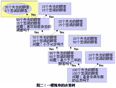 你可以從它的名字中猜到,決策數(shù)是一種樹(shù)型分析模型。樹(shù)枝代表了用來(lái)定義或者細(xì)分客戶(hù)的不同問(wèn)題。比如,假設(shè)一家音樂(lè)俱樂(lè)部想要分析為什么一些會(huì)員不會(huì)再次申請(qǐng)它的會(huì)員資格(該俱樂(lè)部會(huì)員采取月申請(qǐng)制)。為了形成決策樹(shù),公司召集了一批由100個(gè)忠誠(chéng)顧客、100個(gè)非忠誠(chéng)或者已經(jīng)公司已經(jīng)失去的顧客組成的測(cè)試小組。然后,公司開(kāi)始提出一系列問(wèn)題,要求顧客形容一下忠誠(chéng)的顧客和非忠誠(chéng)的顧客是什么樣子的。整個(gè)決策樹(shù)就如圖二所示。