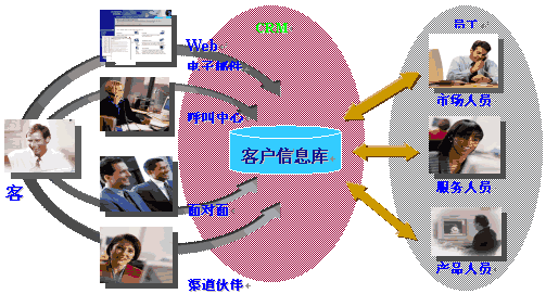 CRM是在90年代,隨著Internet的發(fā)展成熟起來。它充分利用了Internet技術(shù),通過電話中心、網(wǎng)站、電子郵件、移動技術(shù)的使用,提供客戶多種形式的渠道,完成銷售、服務(wù)、市場等多種職能和流程,滿足客戶不同種類、不同層次的需求。這些渠道全方位地收集客戶信息,并通過集中的數(shù)據(jù)庫進(jìn)行管理和共享。而數(shù)據(jù)挖掘技術(shù)幫助企業(yè)進(jìn)一步分析客戶需求,提供決策支持。如下圖(資料來源:Siebel公司)。