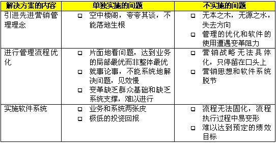在CRM出現(xiàn)以前,企業(yè)為了解決市場、銷售和服務(wù)方面的問題,更好地吸引、獲得、保留和發(fā)展客戶,采取了各種方式,比如使用一套分銷管理的解決方案,或者請"點(diǎn)子公司"出謀劃策,或者尋求某個具體業(yè)務(wù)的優(yōu)化。以上這些做法往往只能完成局部的改進(jìn),或取得短期的效果,無法形成長期和整體的競爭優(yōu)勢。原因就在于這些解決方案都只提供了片面的、局部的解決方案,"頭痛醫(yī)頭,腳痛醫(yī)腳"不能綜合管理理念、業(yè)務(wù)流程和技術(shù)應(yīng)用這三個方面,系統(tǒng)地分析和解決問題。下表中分析了這些解決方案單獨(dú)實施或者不實施會帶來什么問題。