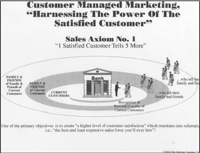 客戶滿意的影響范圍如下圖所示,客戶滿意的力量從里向外逐層波及,以現(xiàn)有客戶的滿意為基礎(chǔ),然后通過推薦傳遞到新的客戶。其傳遞路徑為“現(xiàn)有客戶”——“現(xiàn)有客戶的家人及朋友”——“現(xiàn)有客戶的家人及朋友的家人及朋友”…一直延伸下去最終使企業(yè)的營銷策略大獲成功,這一切的動力都來自于“更高的客戶滿意度引起的客戶行為”。這個營銷公式要取得長期成功沒有任何秘密,它失敗的風險被最小化,因為它依靠的是客戶積極的行動和表現(xiàn),以久經(jīng)考驗的銷售公理——“1個滿意的客戶會把自己的愉快經(jīng)歷告訴5個以上的人!薄獮榛A(chǔ)。