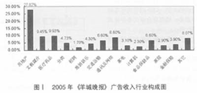 圖Ⅰ顯示,高居榜首的房地產(chǎn)類廣告占了《羊城晚報》廣告總量的27.82%,比第二位的醫(yī)療藥品類廣告多了近2倍。這不僅與《羊城晚報》本身的讀者特點有關,還與廣州房地產(chǎn)市場激烈的競爭有密切的關系,“一般來說,競爭越是激烈的產(chǎn)業(yè),廣告投放量越大,因為,廣告本身就是一種市場競爭手段!