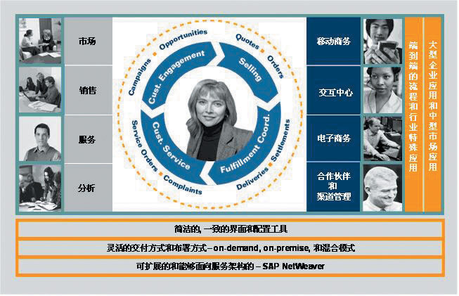 mySAP CRM不僅包含了企業(yè)市場營銷、銷售、服務(wù)、分析等功能,還通過渠道伙伴、現(xiàn)場和移動商務(wù)、交互中心、電子商務(wù)等各種交互渠道形成完整的閉環(huán)式設(shè)計的解決方案。在提供深入的行業(yè)應(yīng)用和傳統(tǒng)的部署方式的同時,mySAP