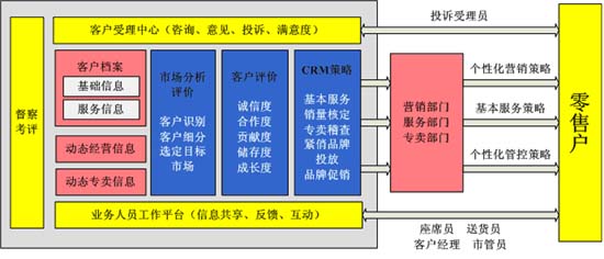 客戶(hù)管理:建立客戶(hù)全面檔案信息,提供客戶(hù)觀察器,對(duì)零售客戶(hù)的基本信息、網(wǎng)建信息、銷(xiāo)售信息、專(zhuān)賣(mài)信息等進(jìn)行360度分析查詢(xún);對(duì)零售客戶(hù)進(jìn)行評(píng)價(jià)與分類(lèi),為差異化服務(wù)和“一對(duì)一營(yíng)銷(xiāo)”提供依據(jù)。