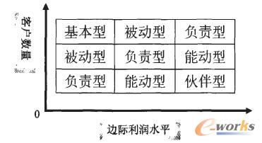 這5種類型之間并不具有簡單的優(yōu)劣對比或順序,因?yàn)槠髽I(yè)所采用的客戶關(guān)系類型取決它的產(chǎn)品以及客戶的特征,不同企業(yè)甚至同一企業(yè)在對待不同客戶時,都有可能采用不同的客戶類型。一家生產(chǎn)日用化妝品的企業(yè),與它的化妝品消費(fèi)者個人之間常會建立一種被動型的客戶關(guān)系,企業(yè)設(shè)立的客戶服務(wù)機(jī)構(gòu)或聯(lián)絡(luò)中心將聽取客戶的意見,處理客戶投訴以及改進(jìn)產(chǎn)品;但這家企業(yè)同大型超市或零售企業(yè),同連鎖的美容產(chǎn)業(yè)機(jī)構(gòu)之間,?赡芙⒁环N伙伴型的客戶關(guān)系,實(shí)現(xiàn)產(chǎn)銷企業(yè)之間的互惠互利?铺乩仗岢,企業(yè)可以根據(jù)其客戶的數(shù)量以及產(chǎn)品的邊際利潤水平,根據(jù)圖3指示的思路,選擇合適的客戶關(guān)系類型。