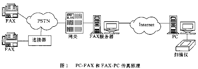 傳真機的基本工作原理是利用光電掃描技術將圖像、文字轉化為采用霍夫曼編碼方式的數字信號,經V.27、V.29方式調制后,按T.30協議在模擬信道上傳輸。由于通信協議、信號格式的不同,傳真機是不能直接在Internet網上傳送信息的。要使連接在PSTN上的傳真機發(fā)出的信號在Internet網上傳輸,基本的原理則是在PSTN和Internet之間構筑網關,由網關進行協議的轉換,使PSTN網的傳真信號和Internet網的數據包可以相互轉換。